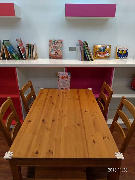 《繪本角落》親子閱讀空間裡有遊戲墊讓小朋友可以席地而坐,放鬆舒服地看看書,也有木頭桌椅可以使用。