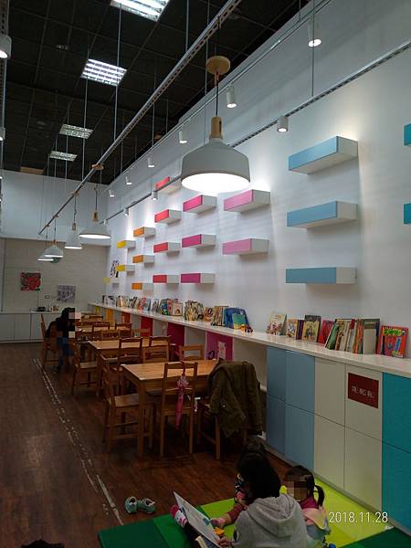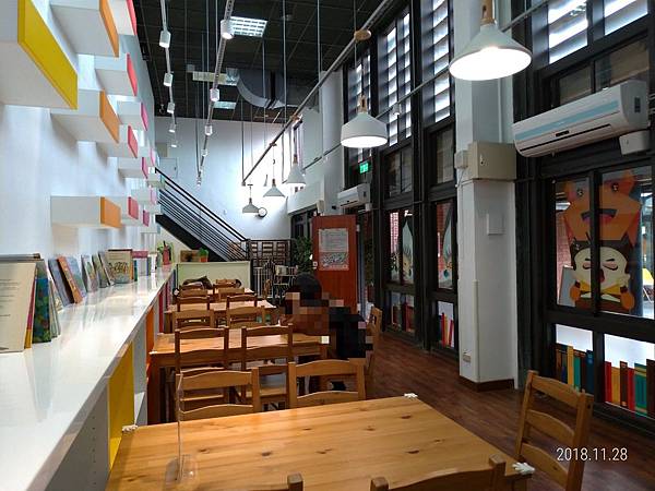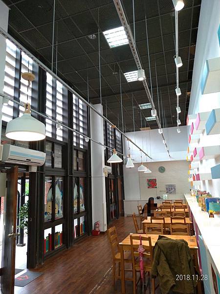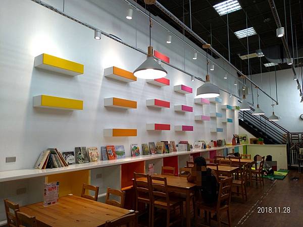 館內挑高天花板的設計讓人感覺空間很寬闊,彩虹顏色的櫃子和牆面上七彩的裝飾好明亮好活潑,在這個空間裡閱讀、放空真的很享受呢~
