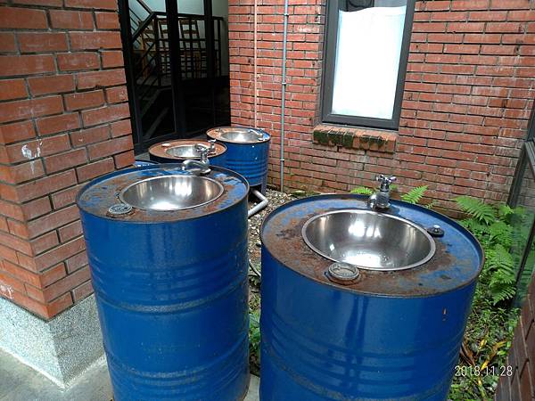 《繪本角落》的旁邊有幾個大鐵桶改造成的洗手台,