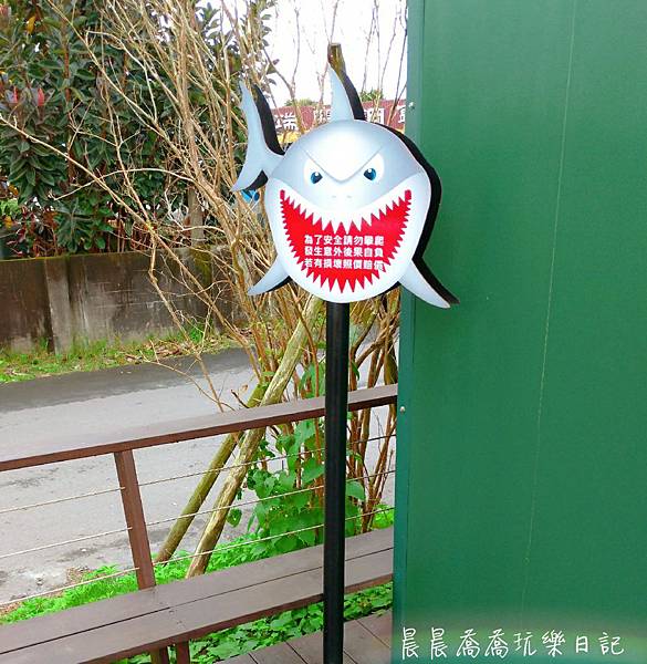鯊魚造型告示牌提醒大家請勿攀爬欄杆!