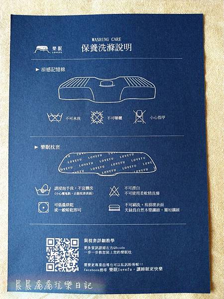盒子裡附有「樂眠枕簡介」,以及「保養洗滌說明」。