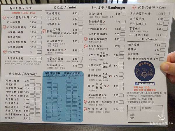有義大利麵、米食、帕尼尼、手作漢堡、開放式吐司、飲品、小點、提拉米蘇等等~