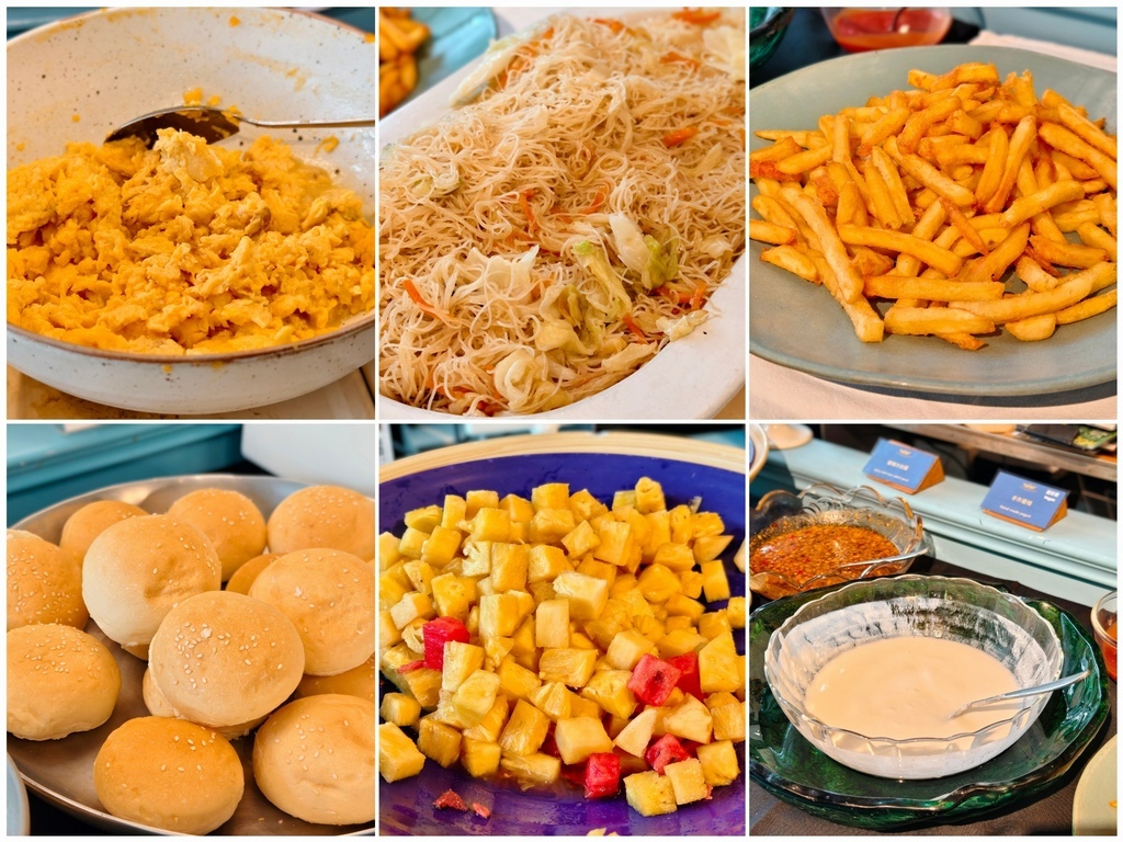 在嘉義安娜與國王飯店的早晨,從一踏進【泰悟餐廳】開始就被濃濃的異國風情包圍。金黃絨布沙發、彩色織布與古銅燈飾交織出浪漫氛圍,讓早餐時光變得特別愜意。自助吧餐點選擇豐富,泰式紅咖哩、打拋豬漢堡、香蘭咖椰吐司、泰式酸奶水果沙拉、泰國香米粥、炒米粉、熱炒蔬菜一應俱全。