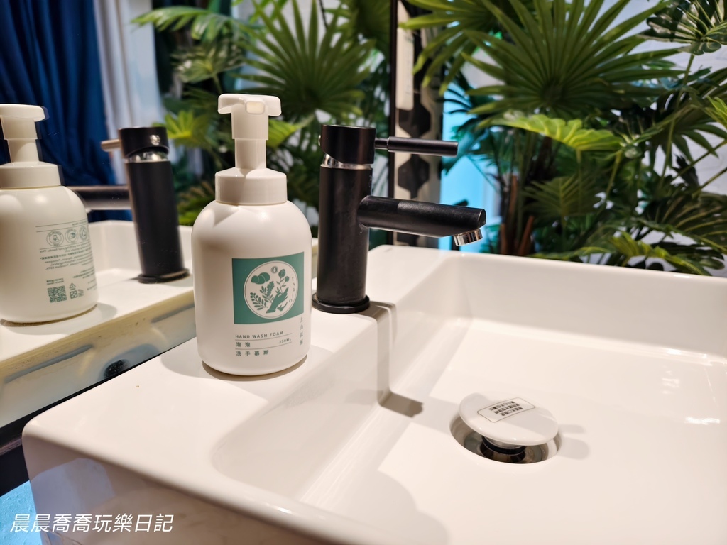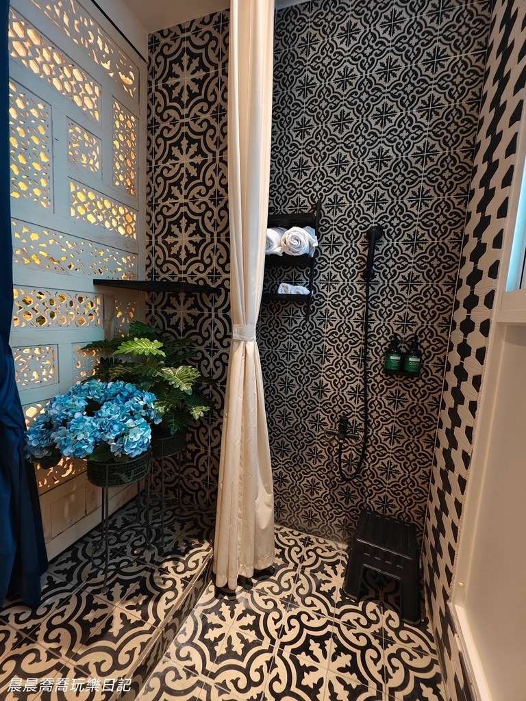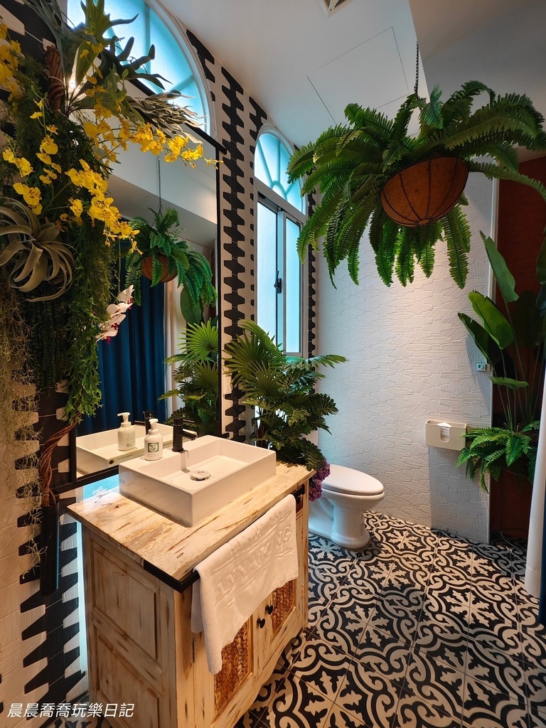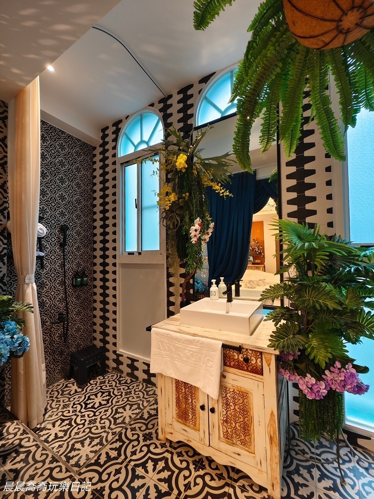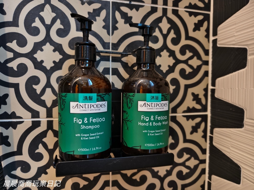 衛浴空間的設計充滿濃濃的熱帶叢林風情,黑白花磚搭配各種花草植栽,感覺好像置身於花園裡,非常特別!衛浴空間和房間是以布幕隔開,浴室採乾溼分離設計,洗沐用品是ANTIPODES的無花果斐濟果洗髮乳和沐浴乳,香甜味道好好聞喔~