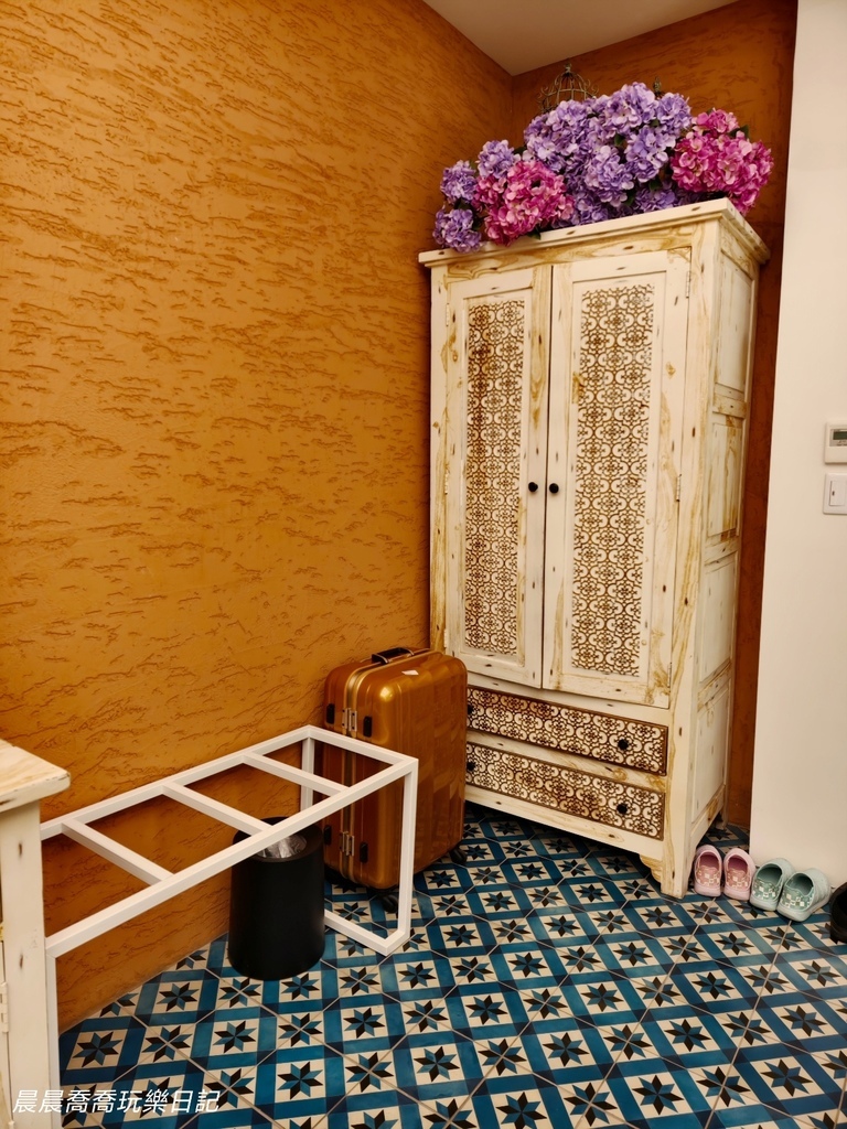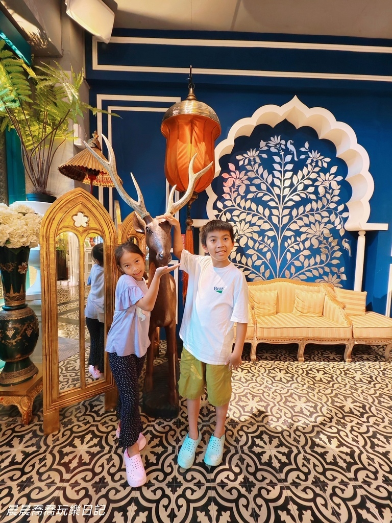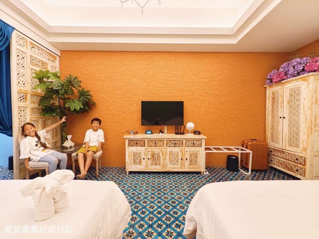 我們這次入住的是「芭達雅主題家庭房」,一打開房門,晨晨喬喬馬上驚呼「好漂亮」!璀璨奪目的水晶燈、飽和色調的牆面、繽紛多彩的地磚、來自泰國的木質家具、點綴的花草植物,真的超有異國渡假感!