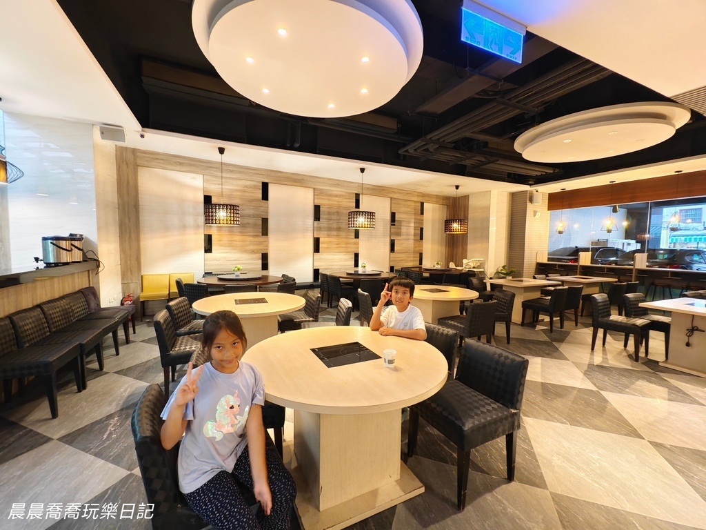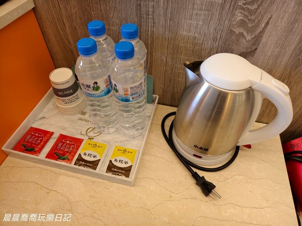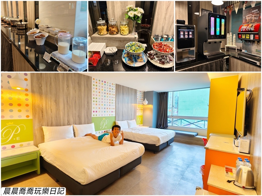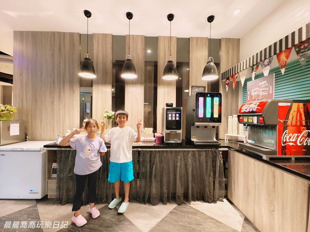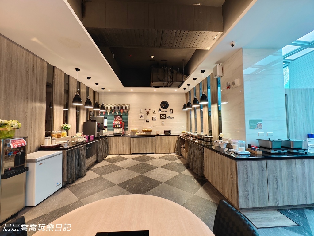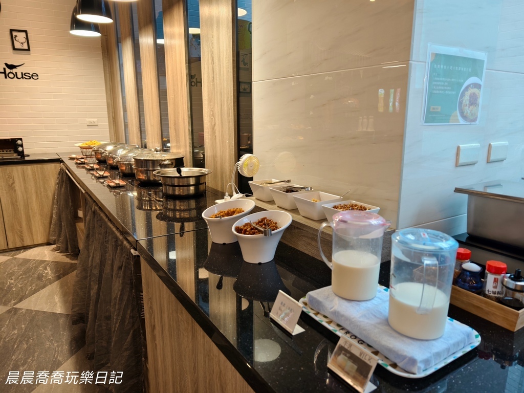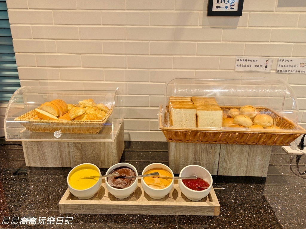 住宿券團購方案有贈送自助式早餐,用餐地點在一樓餐廳,有清粥小菜、吐司、炒蛋、蔬菜、水果、豆漿和咖啡。晨晨自己拿了一盤炒蛋加熱狗,喬喬則是吃了好幾片烤土司,一口接一口。還有自助式現煮湯麵,一大早吃碗熱騰騰的湯麵,暖胃好舒服!