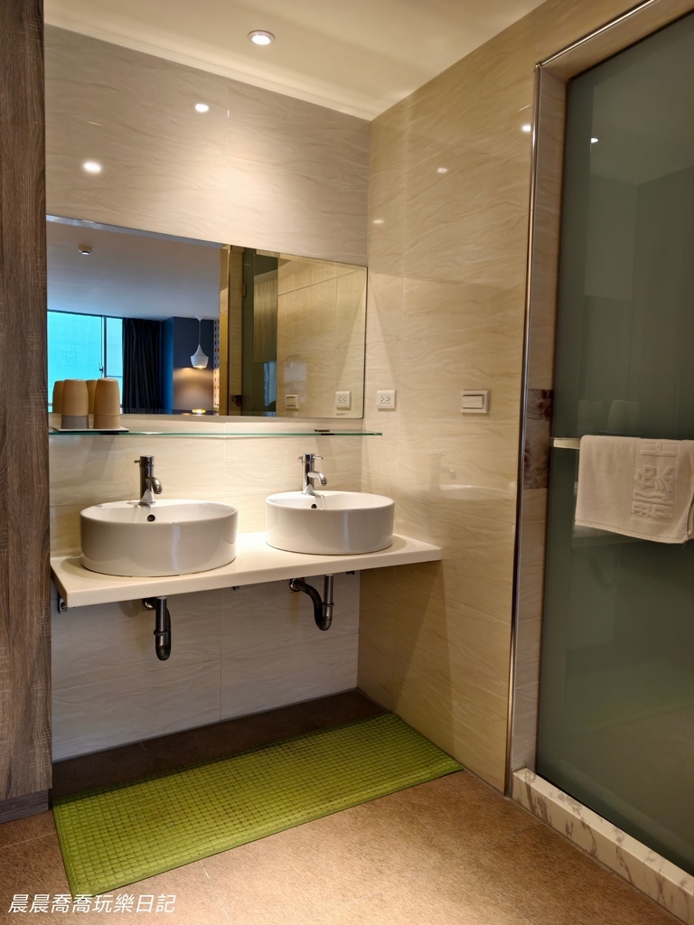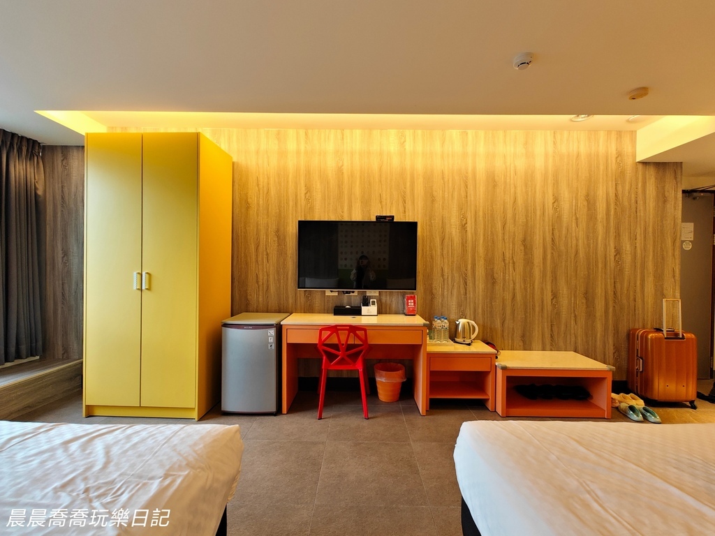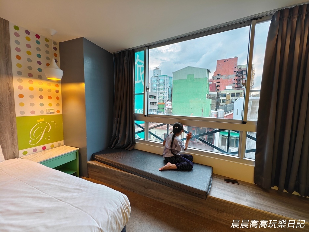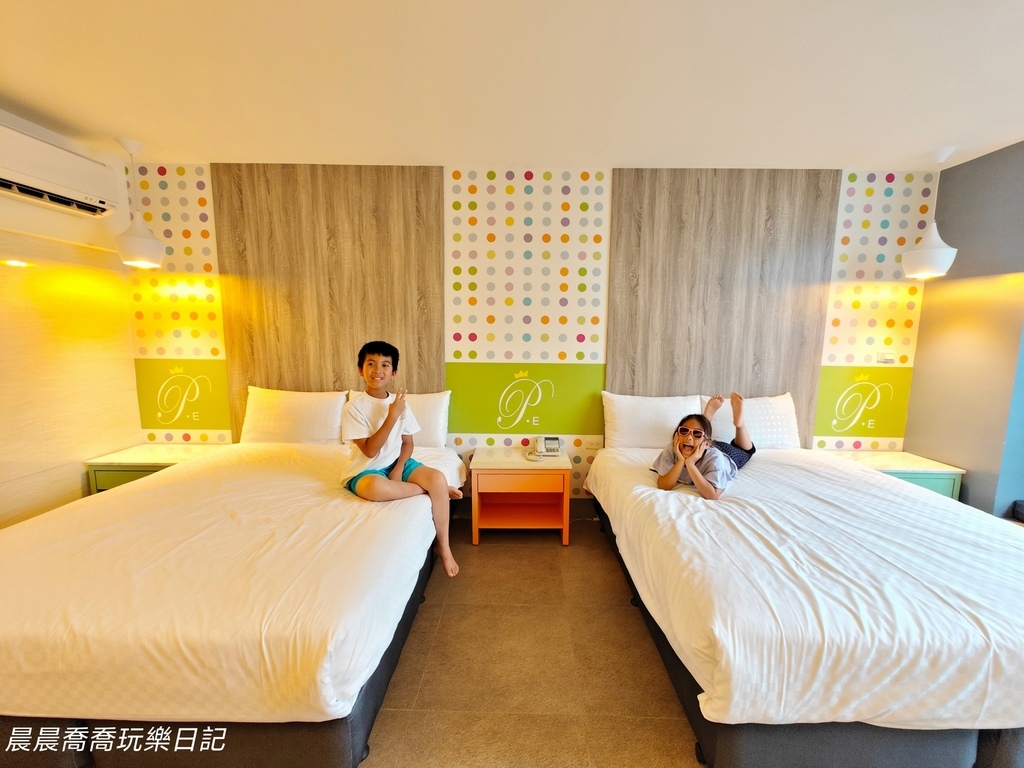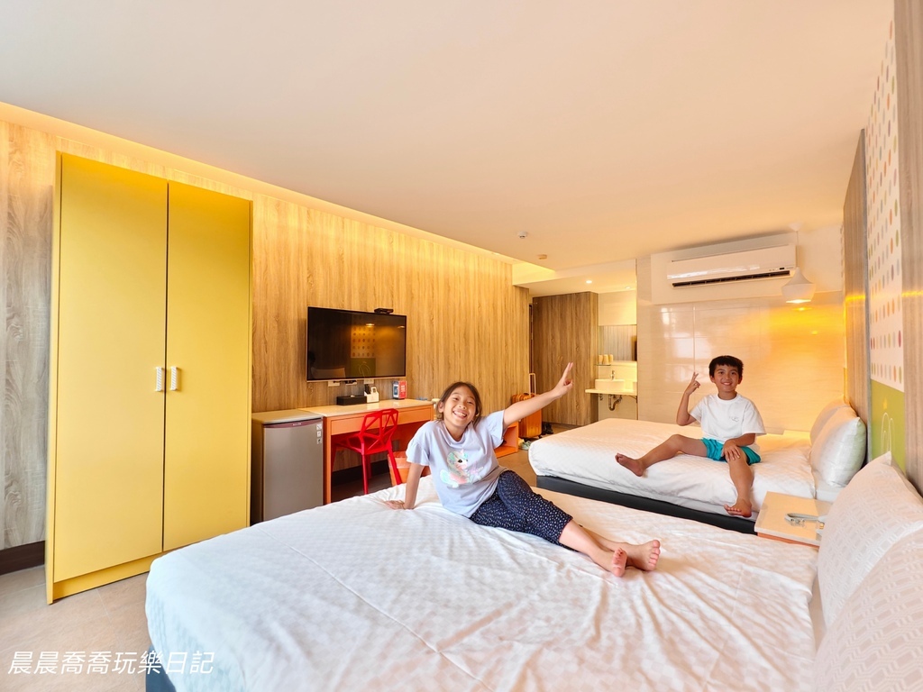 我們入住的是四人家庭房,一打開門晨晨喬喬就忍不住「哇~」了一聲。寬敞舒適的空間,整體裝潢以溫暖木質色調為主,地板踩起來很舒服,四人房有兩張雙人床,床墊軟硬適中,枕頭也很好睡。晨晨直接撲上去翻滾,喬喬則在床邊拉著窗簾看市區街景,採光很好。