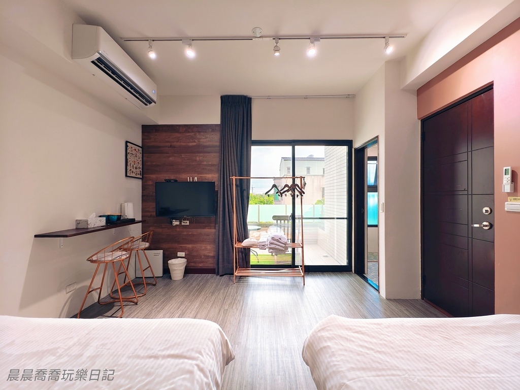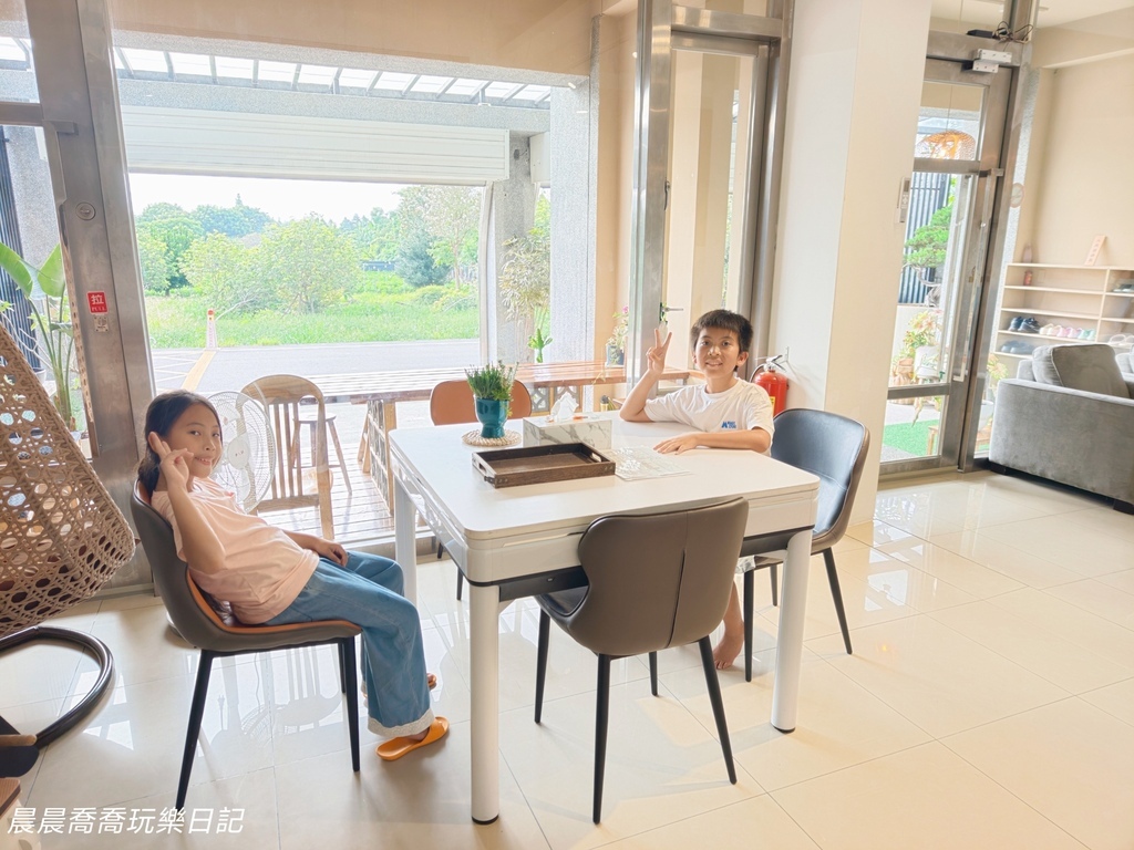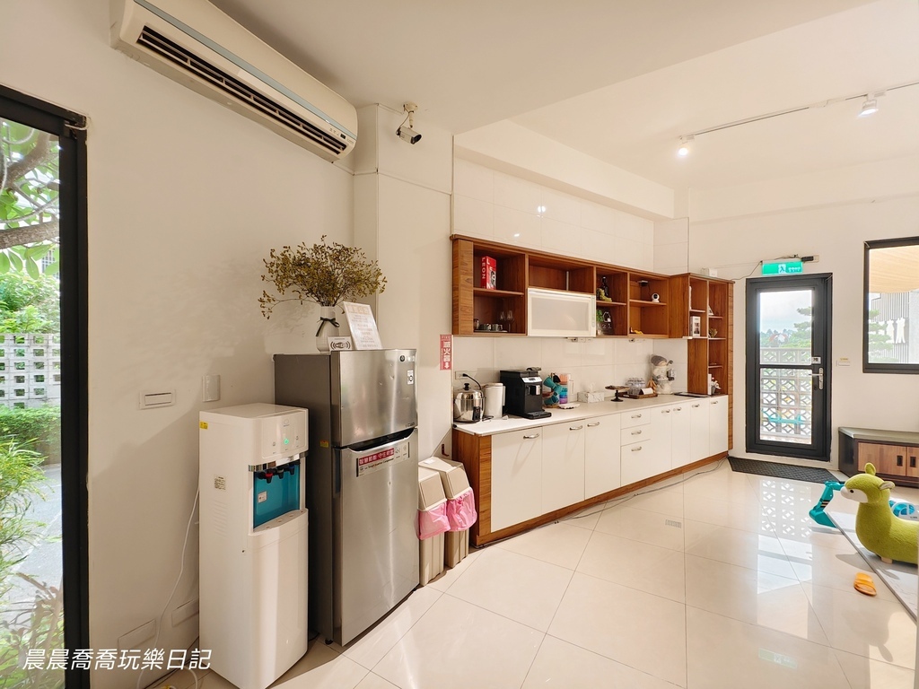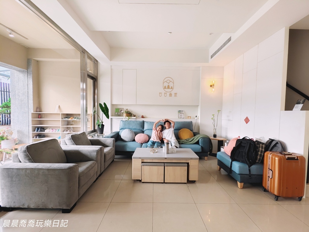 《日日森旅》為三棟透天民宅組成,分為A、B、C三棟,可滿足不同人數的包棟需求。A棟和B棟可以合併包棟,C棟可以獨立包棟。我個人滿推薦包棟,包棟可以使用「KTV包廂、露天烤肉區、麻將桌、行動式點唱機」,這些設施只有包棟才會開放使用。民宿一樓為公用空間,大面落地窗,寬敞客廳、咖啡機、電鍋、冰箱、飲水機,設備齊全,很適合親子家庭住宿。想要和家人朋友一起包棟也沒問題,團購方案只要3張住宿券6人就能輕鬆包棟,還送6位7歲以下小孩免費住!快跟著晨晨喬喬一起play!