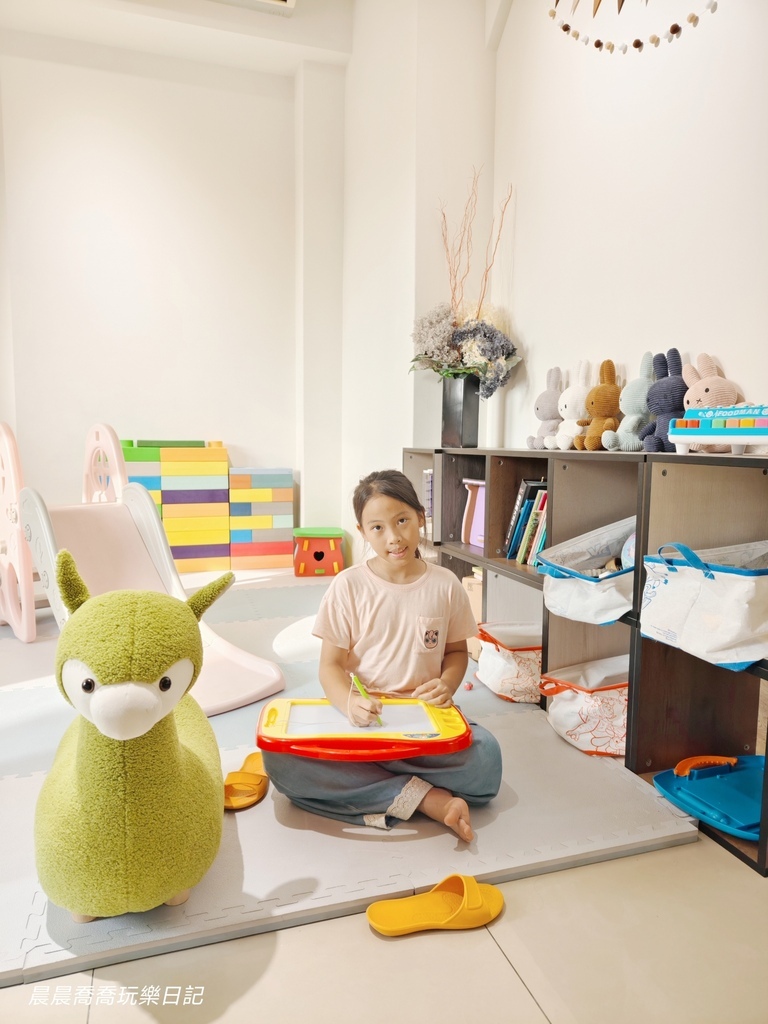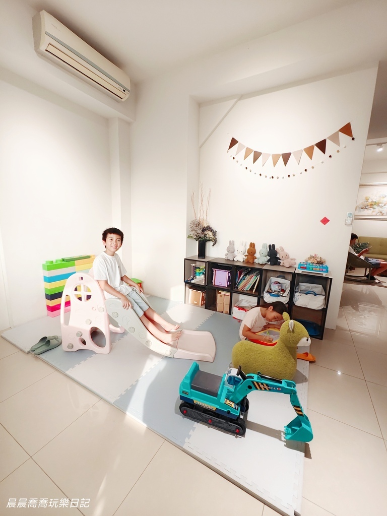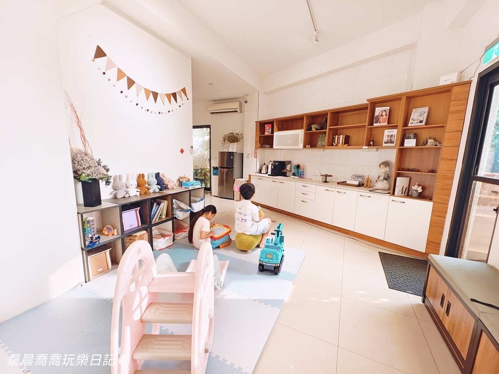 遊戲區有小滑梯、軟墊地板、跳跳馬、玩具車、故事書、桌遊,很適合小小孩玩耍,大小孩可以到民宿旁邊的甜心園兒童遊戲場玩,有攀爬設施、溜滑梯、盪鞦韆等各種遊樂器材可以放電!