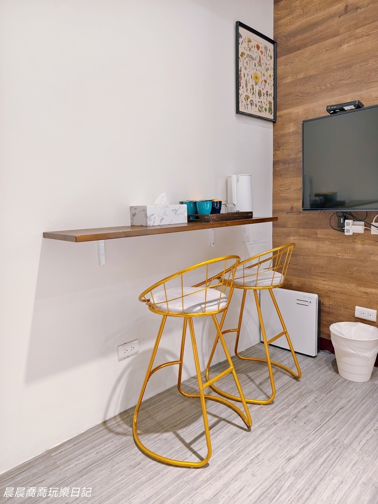 房內有一區高腳椅桌台,爸媽可以放飲料、泡奶或充電,完全不會佔到主要空間。晨晨還跑去那邊寫作業,也太認真啦!