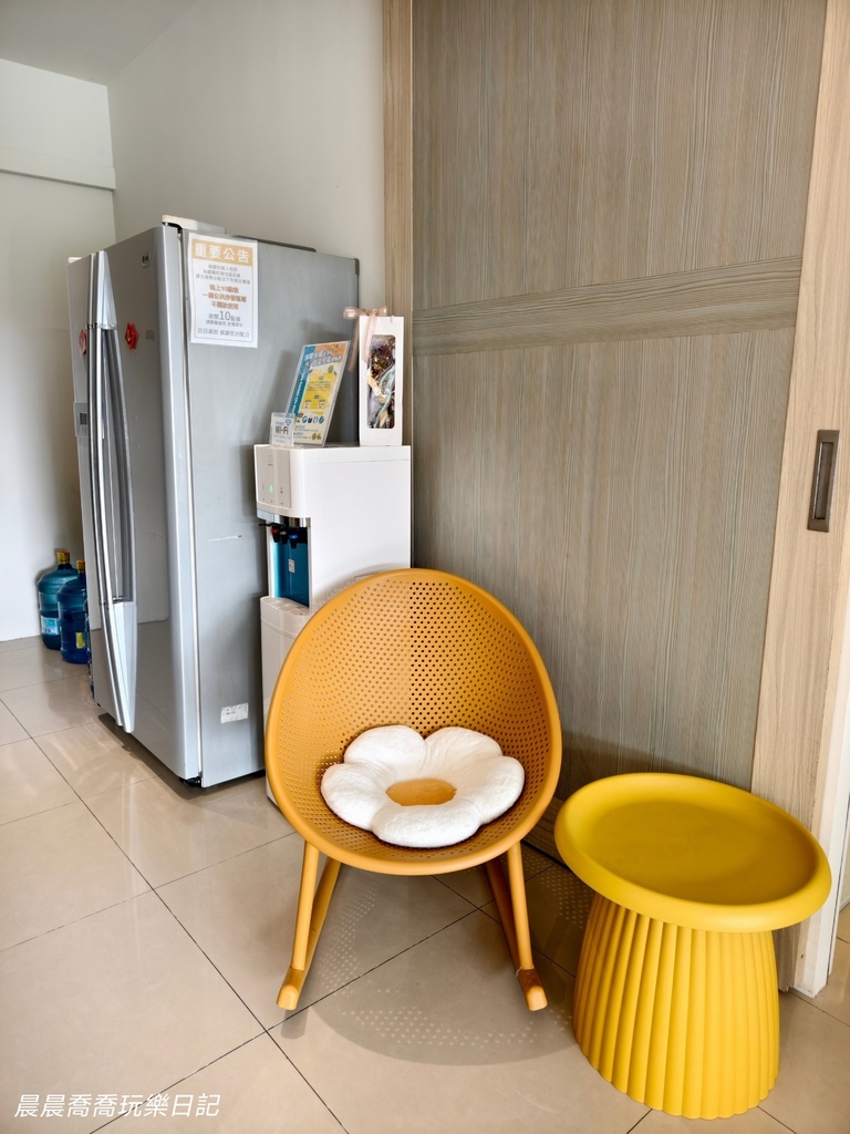 一樓大廳空間超級寬敞,和家人好友多人一起包棟也不怕擠不下,大大的落地窗採光很好,暖暖的陽光灑進來感覺好溫馨。有電動麻將桌(包棟專屬設施)、藤籃搖椅、冰箱和飲水機。