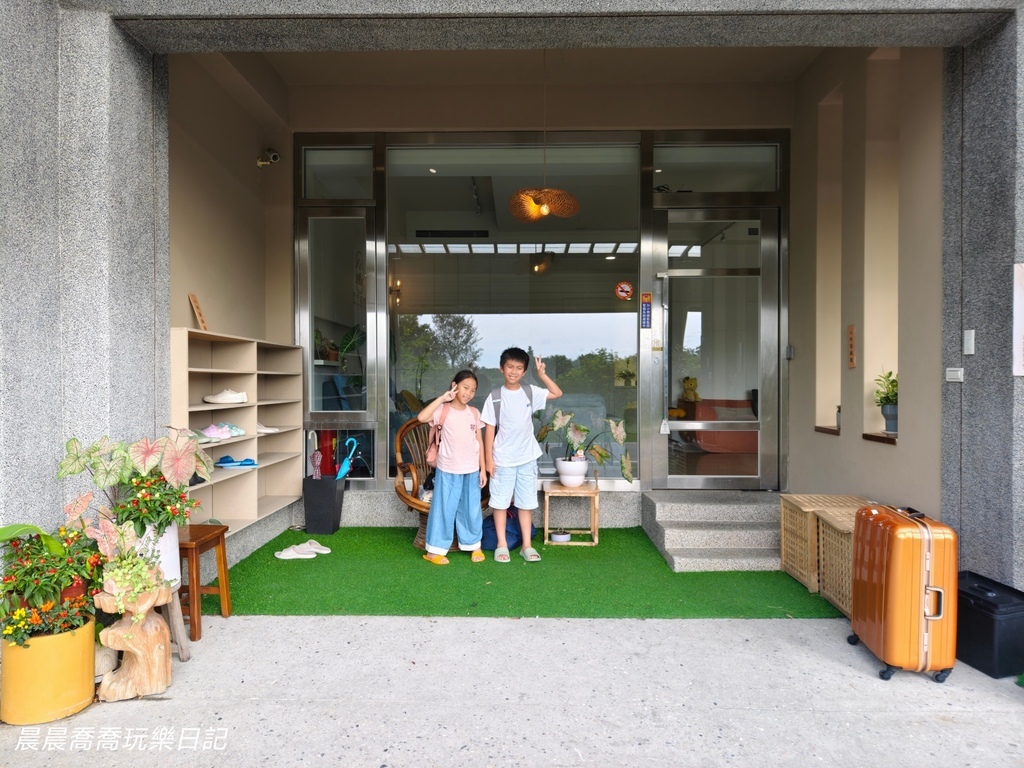 到達《日日森旅》,晨晨喬喬先是被大門口的綠意吸引,接著兄妹倆發現門口有提供室內拖鞋給住宿客人換上,穿上軟QQ的室內拖真的好舒服,讓旅行的疲憊感瞬間消失,大門口旁邊還有一大張木桌,包棟客人可以在長桌這裡烹煮食物,或是喝下午茶,吃點心,享受放空時光!