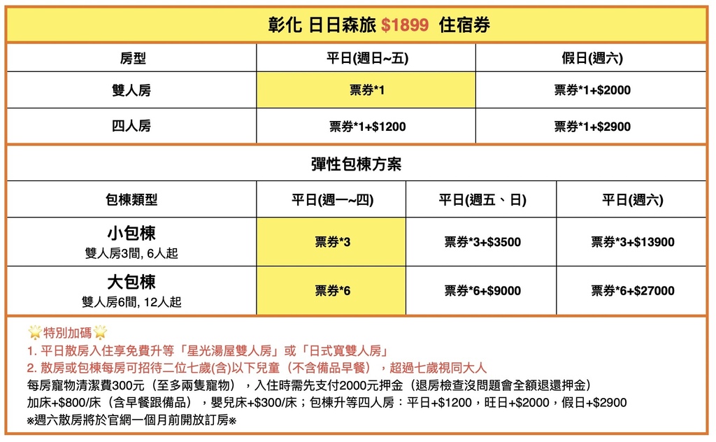 🌿一張住宿券可享「平日雙人房入住一晚含早餐」, 假日使用+$2000,平日四人房+$1200,假日四人房+$2900 ,加床+$800/床(含早餐跟備品),嬰兒床+$300/床。