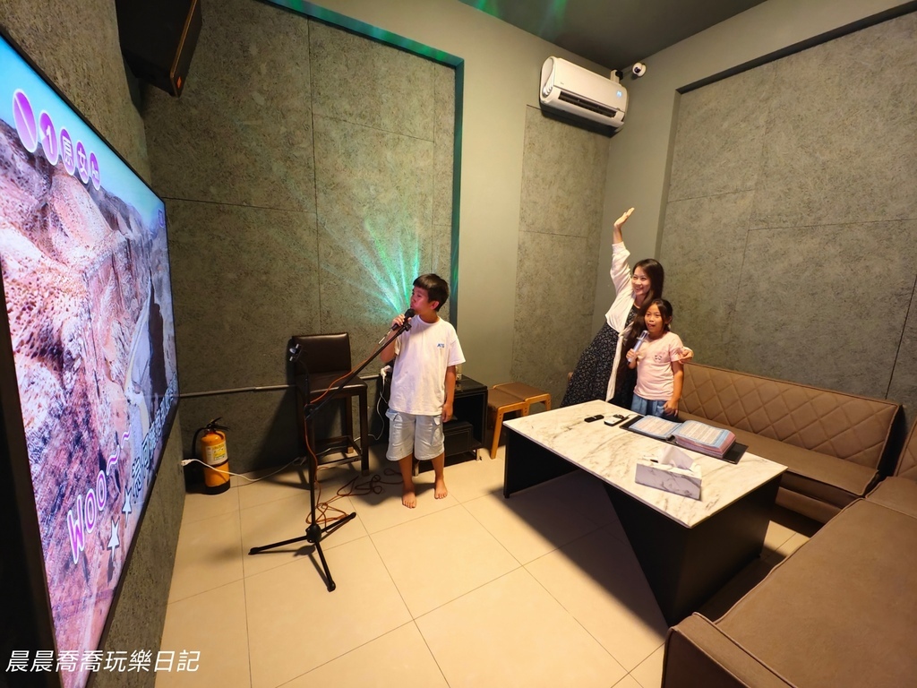 KTV包廂在C棟客廳旁,空間很大,目測約能容納10人左右,盡情歡唱好開心!